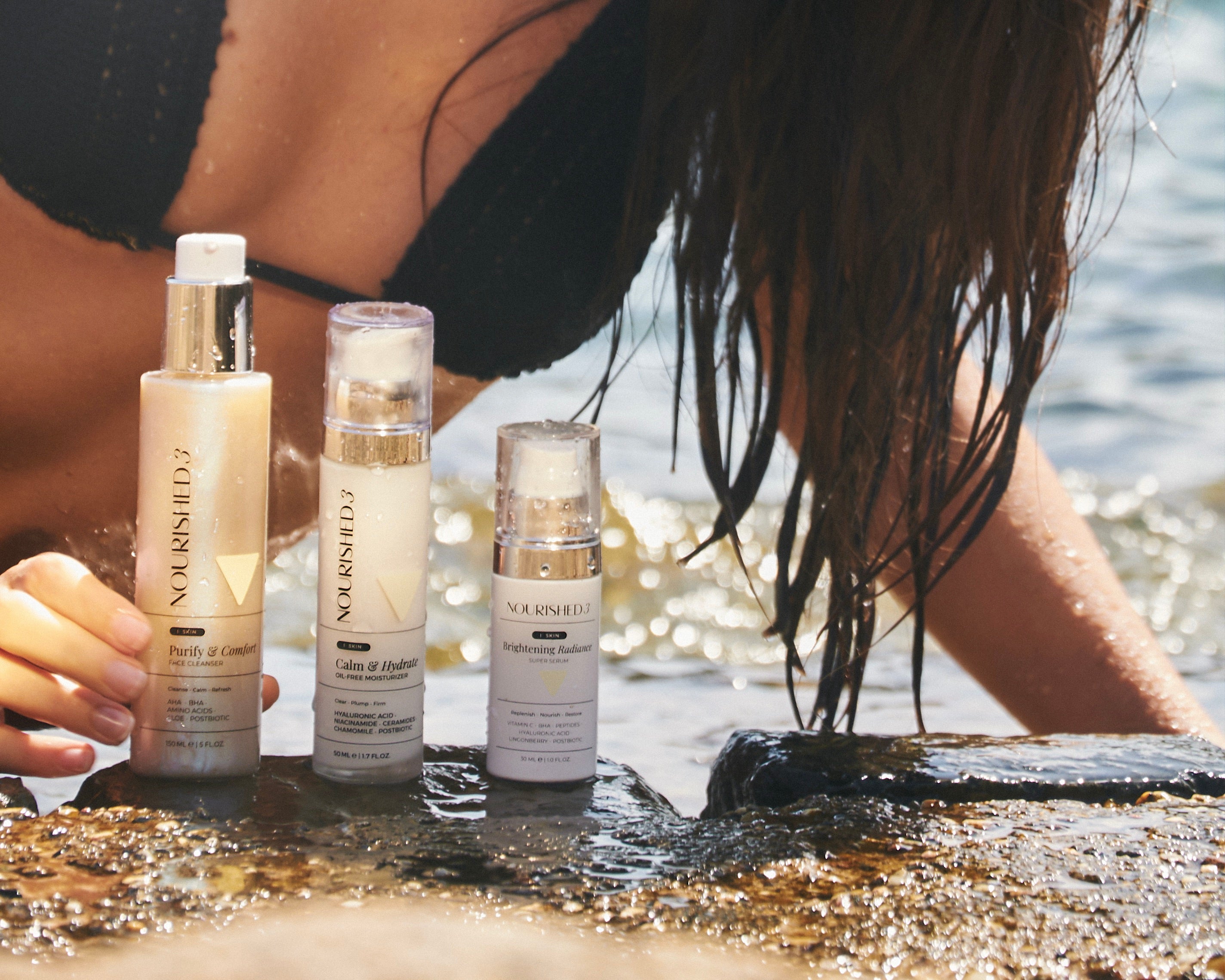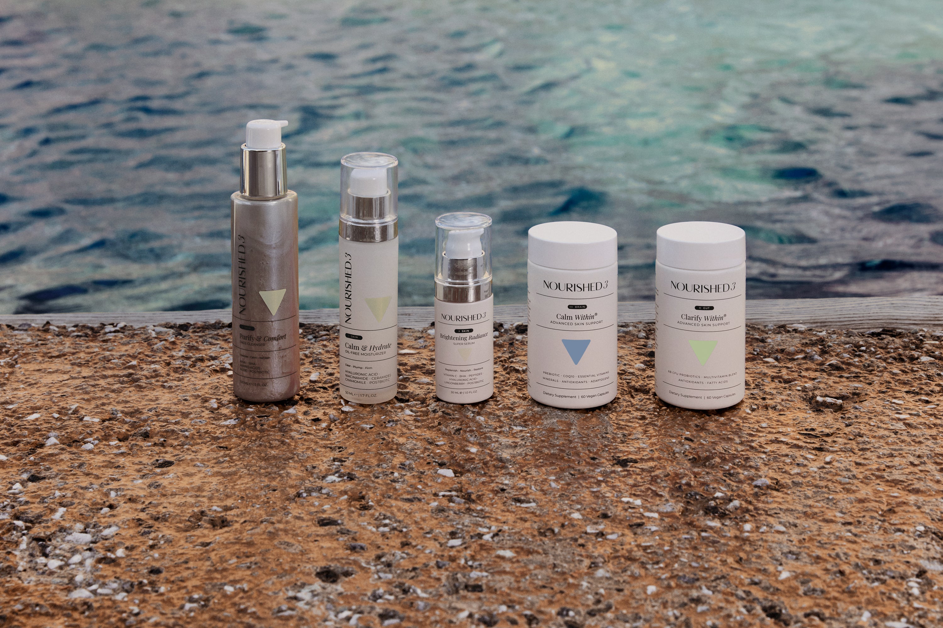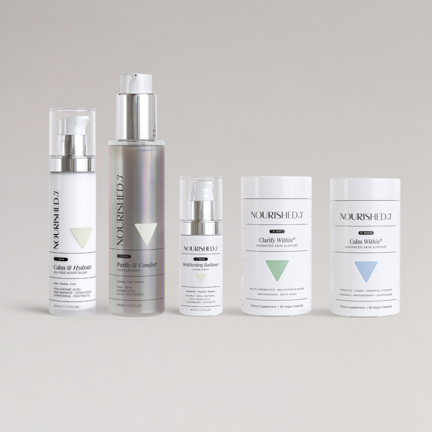 We target over 300 biomarkers that connect your skin, gut, and brain. Stress, hormones, and gut imbalance trigger inflammation that shows up as acne, redness, and dullness. Traditional skincare only treats the surface — we address the root cause. Nourished3 is the first skincare system designed to optimize the Skin–Gut–Brain connection, restoring balance from within so you can glow with confidence, clarity, and calm.