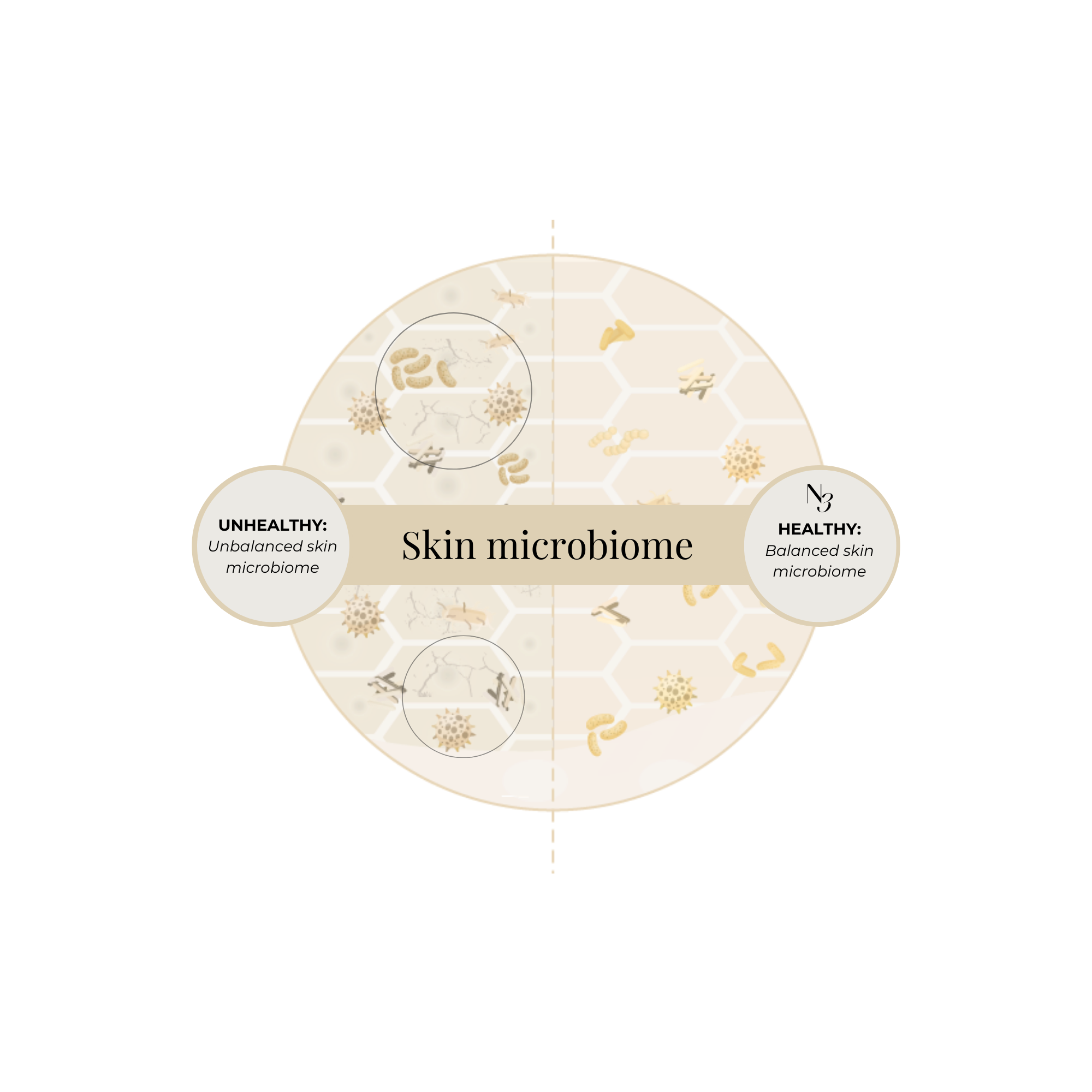 Here is an example of an unhealthy & healthy skin microbiome. The skin’s microbiome is an ecosystem that is made up of billions of bacteria, viruses, and fungi. The skin microbiome in the follicle is composed of a diverse group of microorganisms. The primary role of the skin is to serve as a physical barrier, protecting our bodies from potential assault by foreign organisms or inflammatory substances such as acne causing bacteria. It is essentially the skin’s first line of defence against bad bacteria, viruses, and fungi that can lead to acne. On our face especially, where there are more bad bacteria than good, acne develops and this is problematic for achieving clear skin. A balanced skin microbiome is vital for healthy, clear, acne free skin.