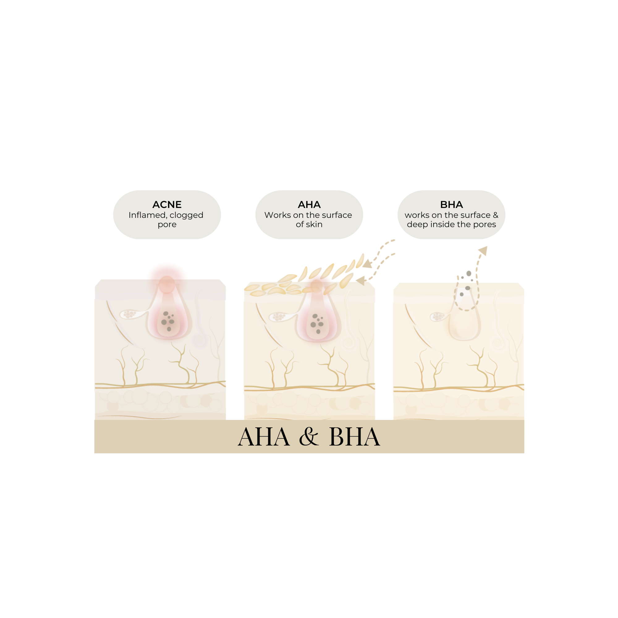 Our Mask & Cleanser include both a BHA-Salicylic acid that finds application in treating almost all aspects of the skin. Additionally, BHA can target all the links in the acne-causing chain of cause and effect, making it one of the best ingredients for acne prevention. BHA treatments are typically used for clogged pores, blackheads, whiteheads, acne, cysts. BHA treats acne by working deep within the pore by reducing swelling, redness and releasing blocked pores to allow breakouts to diminish.