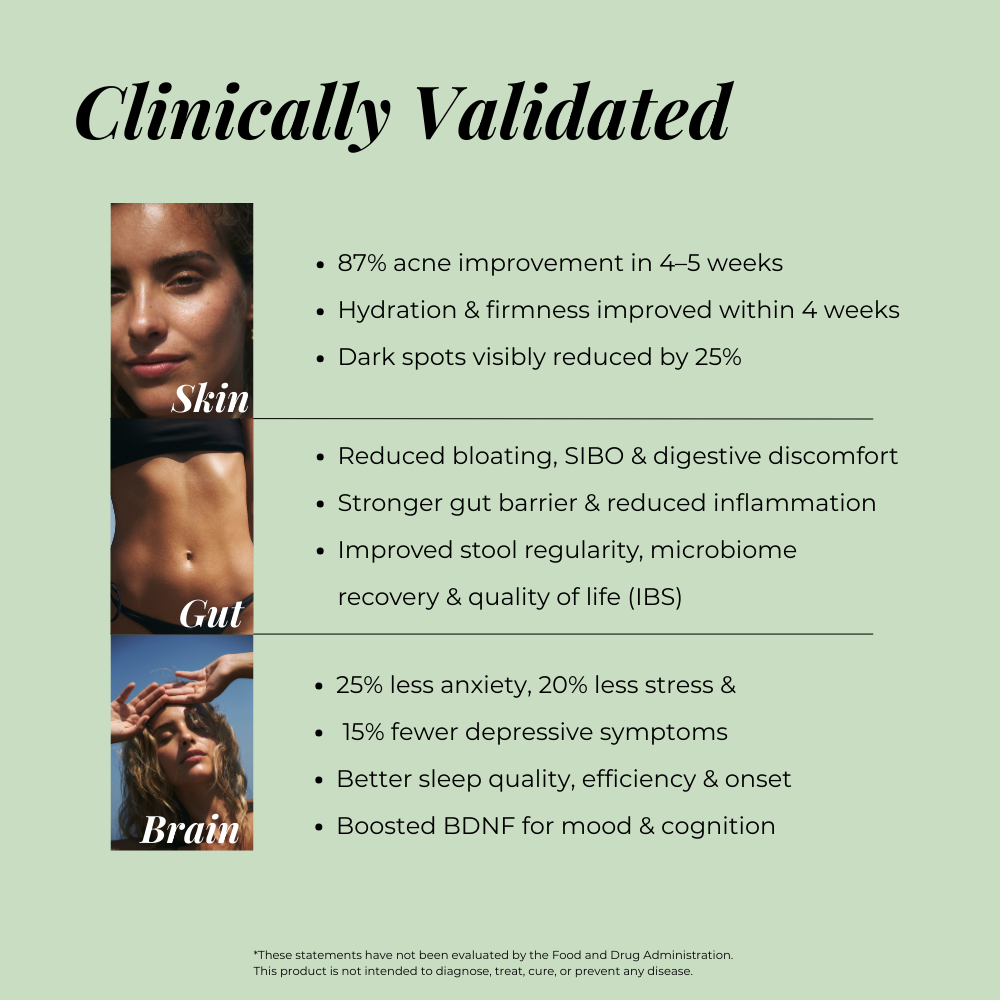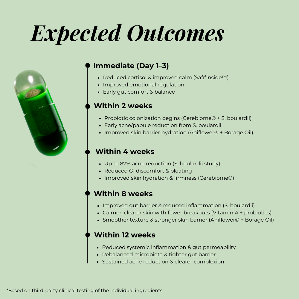 Some users notice improvements in mood and gut comfort within 1–2 weeks, while skin clarity and hydration typically become more visible after 6–12 weeks of consistent use, in line with clinical studies on our key ingredients.