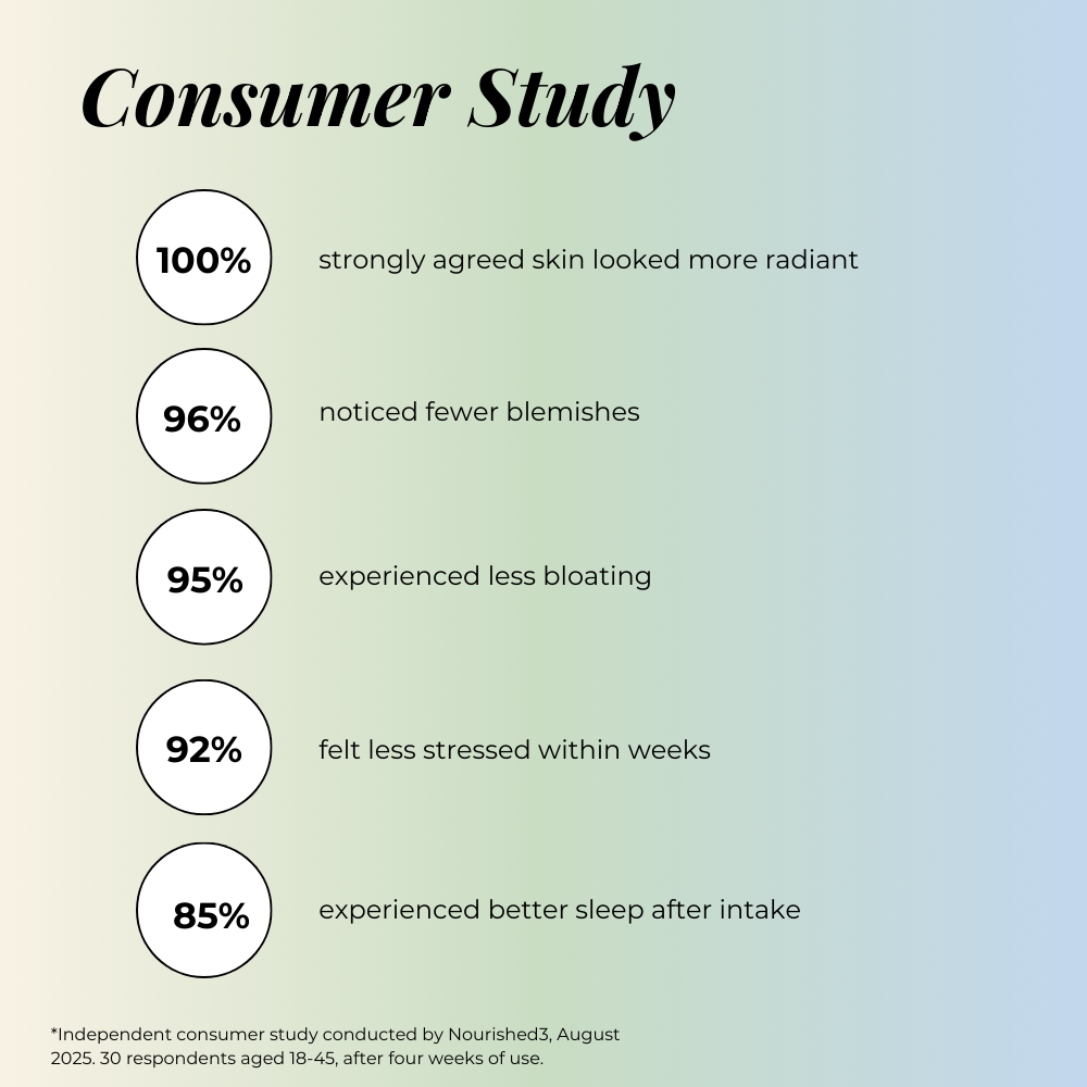 *Independent consumer study conducted by Nourished3 in August 2025. Results based on 30 participants aged 18–45 after four weeks of use.