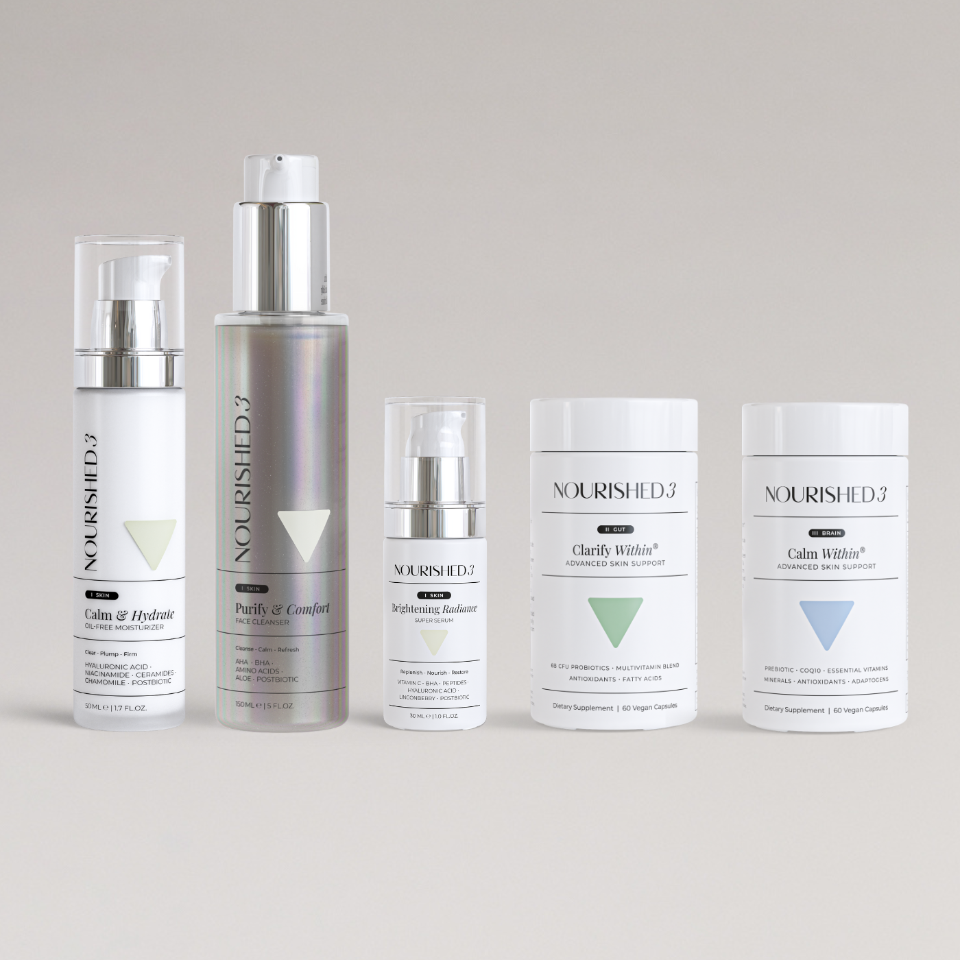 Lasting skin health comes from prevention, not just treatment. At Nourished3, we go beyond surface care with a complete inside-out system — the Triple Biotic™ Symbiotic Collection — combining skincare and supplements to target the skin–gut–brain axis from every angle.